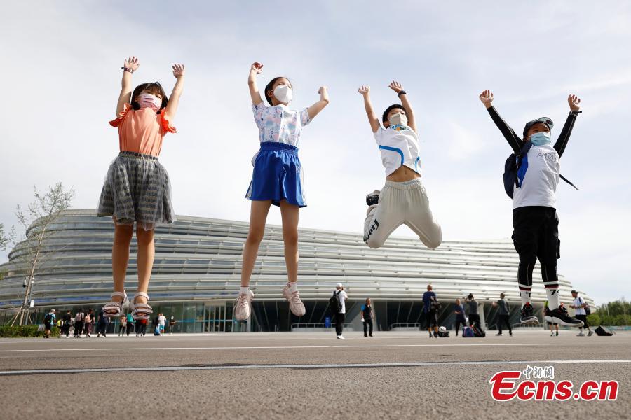 Children pose for photos outside the National Speed Skating Oval, known as 'Ice Ribbon' in Beijing, July 9, 2022. (Photo: China News Service/Fu Tian)