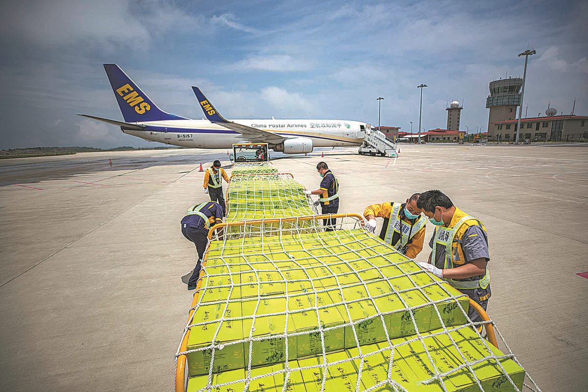 A cargo of plums is loaded aboard a plane at Chongqing Wushan Airport. Plums arrive in Nanjing, Jiangsu province, from Chongqing. HUANG WEI/XINHUA
