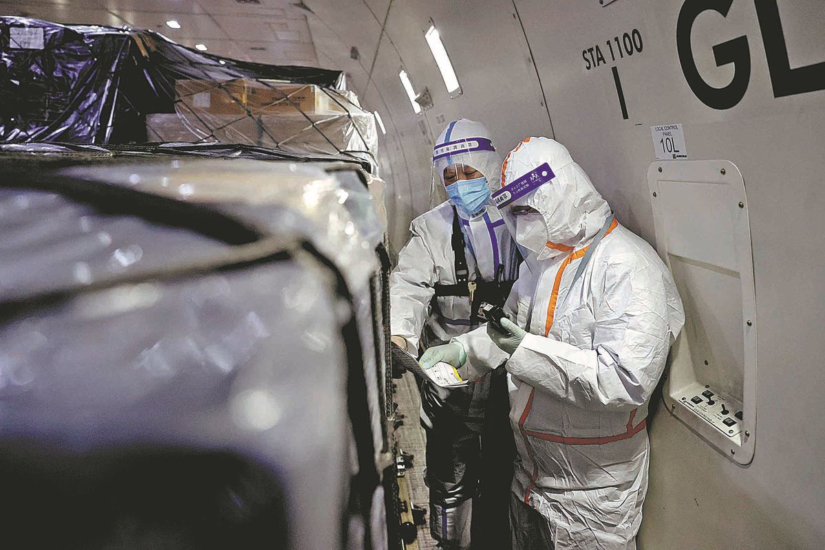 Border control officers inspect paperwork for cargo aboard a plane in Yantai, Shandong province, in January. QIAN CHENG/FOR CHINA DAILY