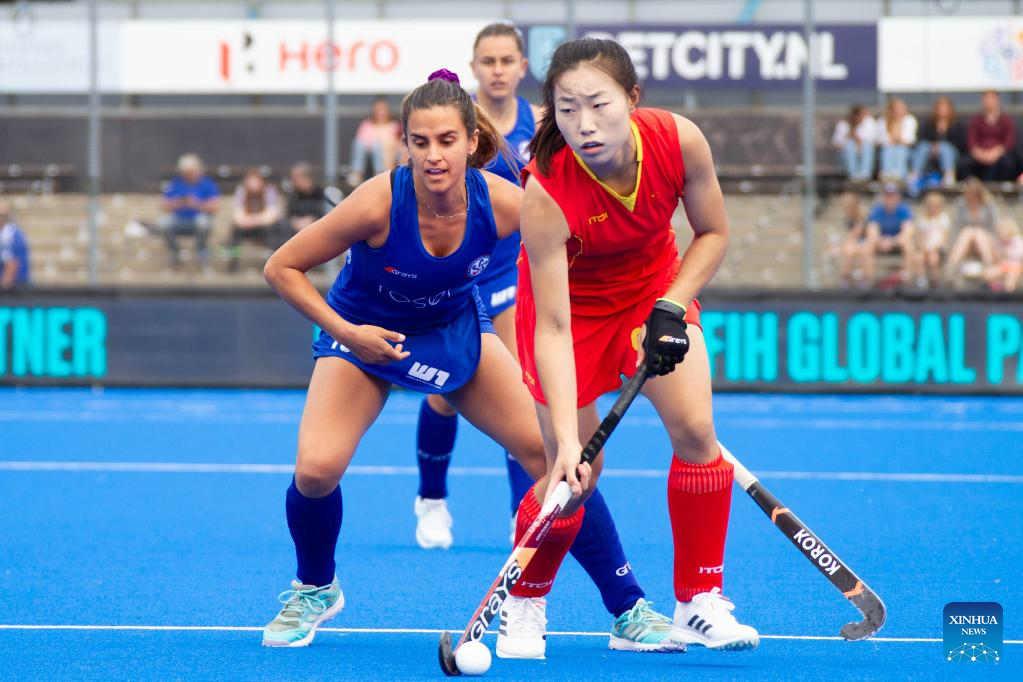 Chen Yang of China controls the ball during the FIH Hockey Women's World Cup 2022 match between China and Chile in Amsterdam, the Netherlands, July 10, 2022. (Photo by Sylvia Lederer/Xinhua)