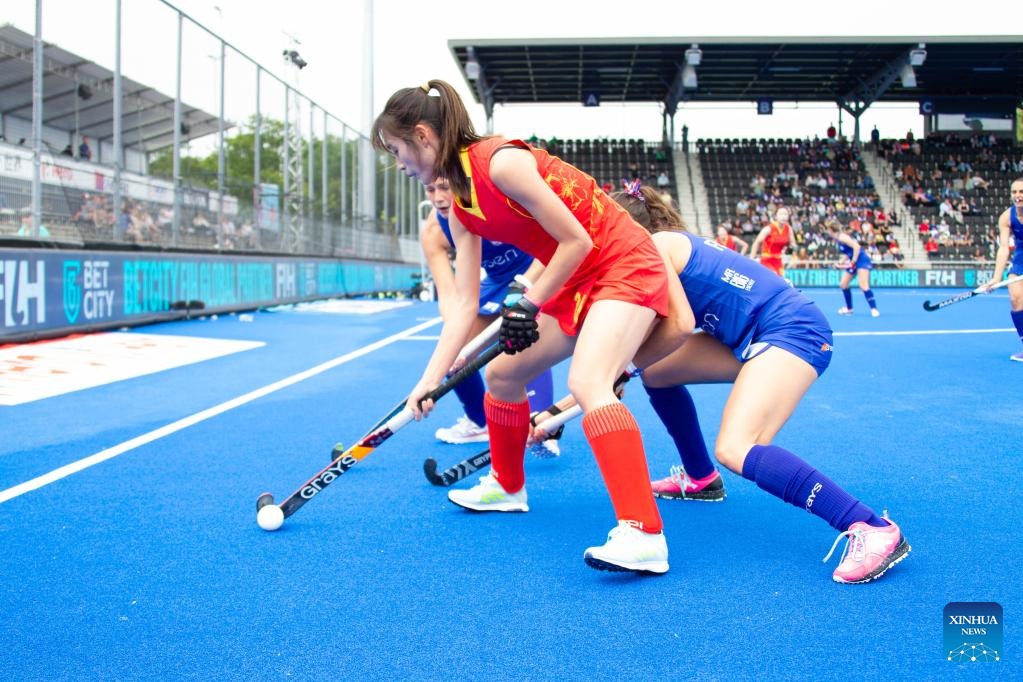 Luo Tiantian of China controls the ball during the FIH Hockey Women's World Cup 2022 match between China and Chile in Amsterdam, the Netherlands, July 10, 2022. (Photo by Sylvia Lederer/Xinhua)
