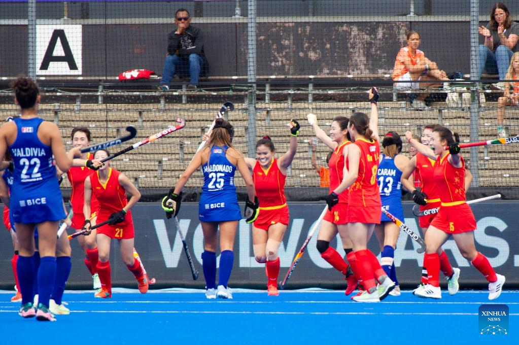 Players of China celebrate a goal during the FIH Hockey Women's World Cup 2022 match between China and Chile in Amsterdam, the Netherlands, July 10, 2022. (Photo by Sylvia Lederer/Xinhua)