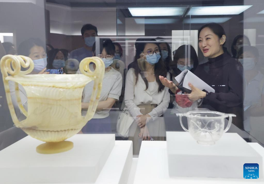 A staff member introduces an exhibit at the exhibition titled "Tota Italia -- Origins of a Nation" at the National Museum of China in Beijing, capital of China, July 11, 2022.