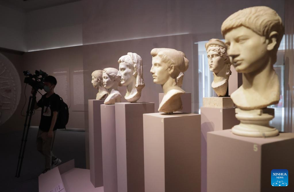 A journalist visits the exhibition titled "Tota Italia -- Origins of a Nation" at the National Museum of China in Beijing, capital of China, July 11, 2022.
