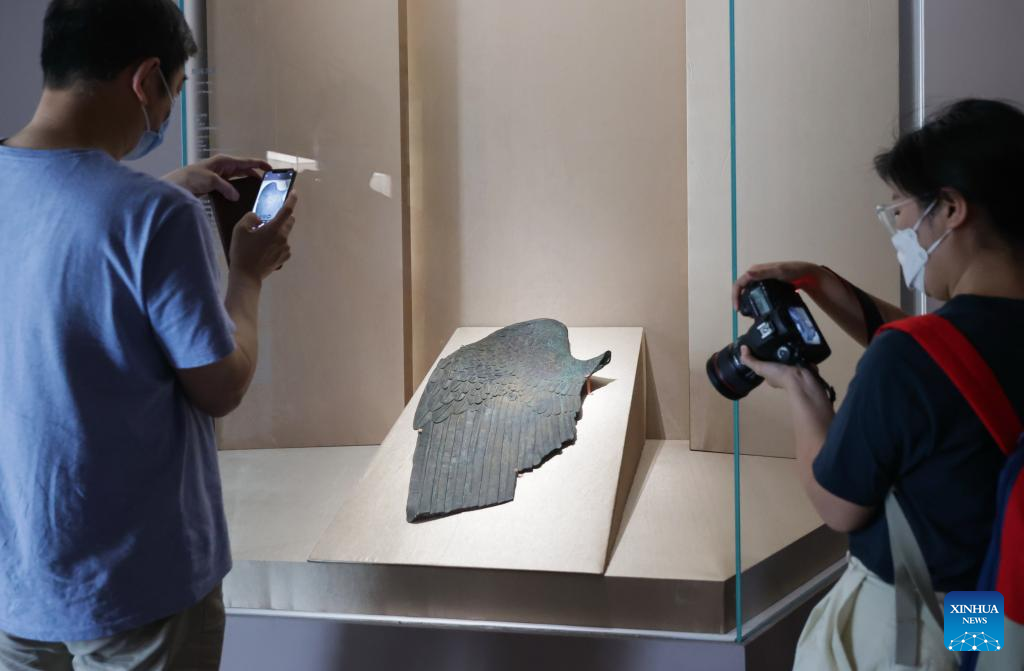 A visitor takes photos of an exhibit at the exhibition titled "Tota Italia -- Origins of a Nation" at the National Museum of China in Beijing, capital of China, July 11, 2022.