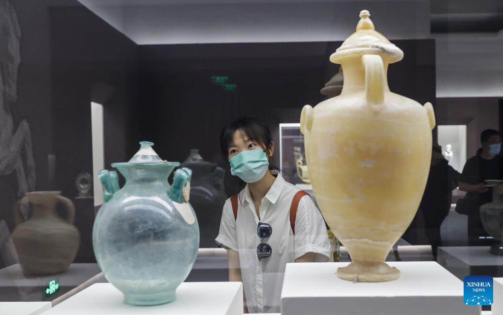 A visitor views exhibits at the exhibition titled "Tota Italia -- Origins of a Nation" at the National Museum of China in Beijing, capital of China, July 11, 2022.(Xinhua/Zhang Yuwei)