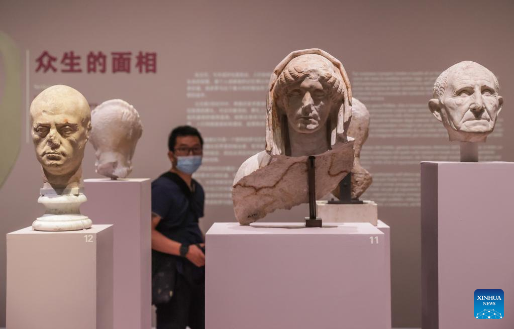 A visitor views exhibits at the exhibition titled "Tota Italia -- Origins of a Nation" at the National Museum of China in Beijing, capital of China, July 11, 2022.