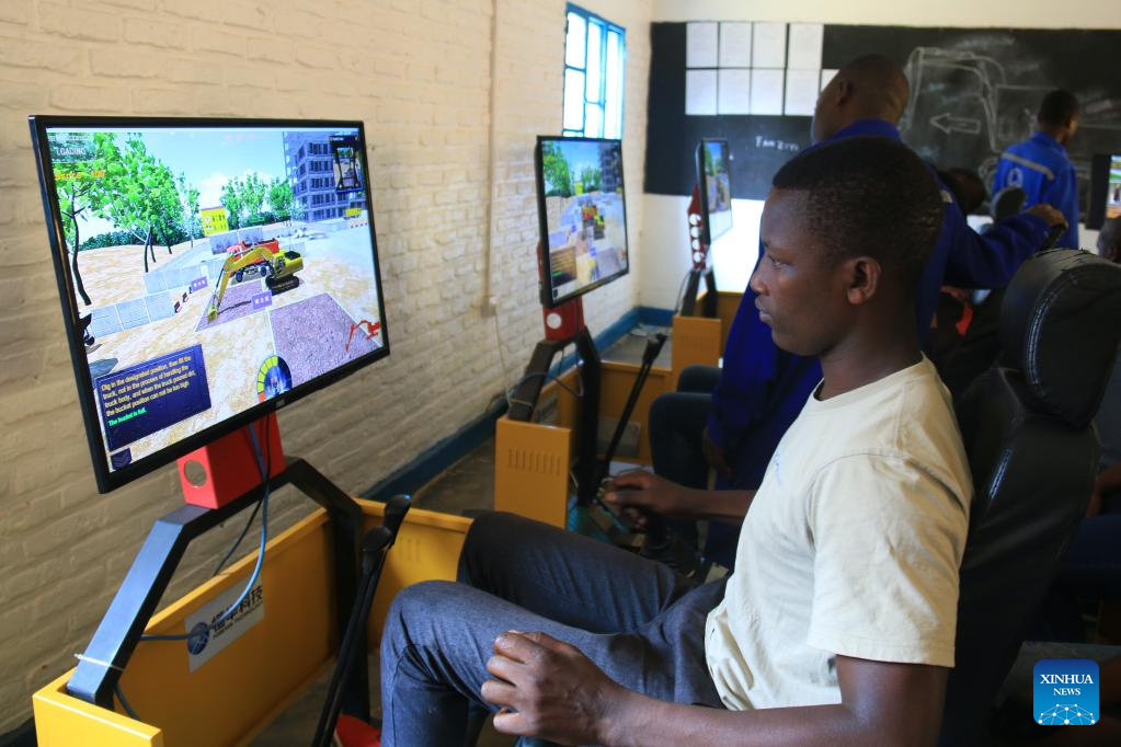 A student learns the operation of heavy machinery through a simulator at Forever TVET Institute in Kigali, Rwanda, July 8, 2022. Located in Kigali, capital of Rwanda, Forever TVET Institute provides skill training courses to increase young students' prospects in the job market.