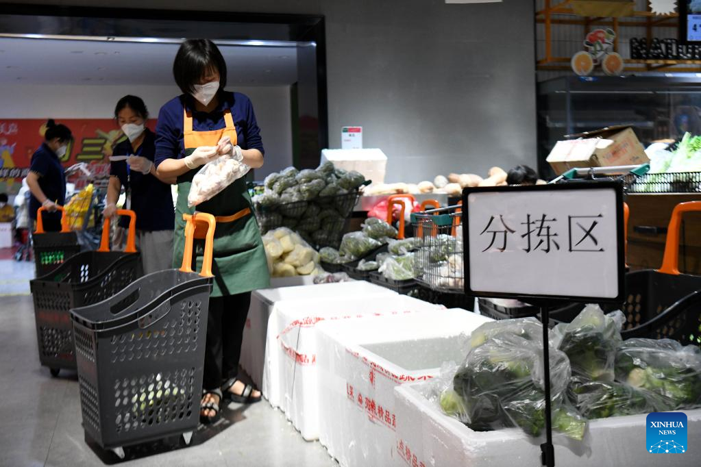 Staff members select goods ordered online at Jiamei Supermarket in Sixian County, Suzhou City, east China's Anhui Province, July 4, 2022. (Xinhua/Huang Bohan)