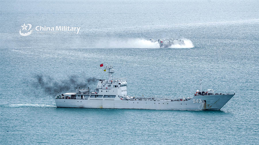 A Type 073A amphibious landing ship and an air cushion landing craft sail to a designated area during a collaboration exercise jointly conducted by an army brigade and a navy unit under the PLA Eastern Theater Command on June 16, 2022. (eng.chinamil.com.cn/Photo by Lin Jiayu)
