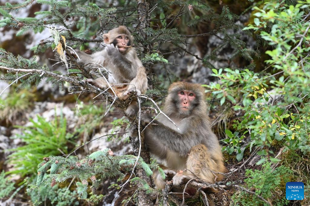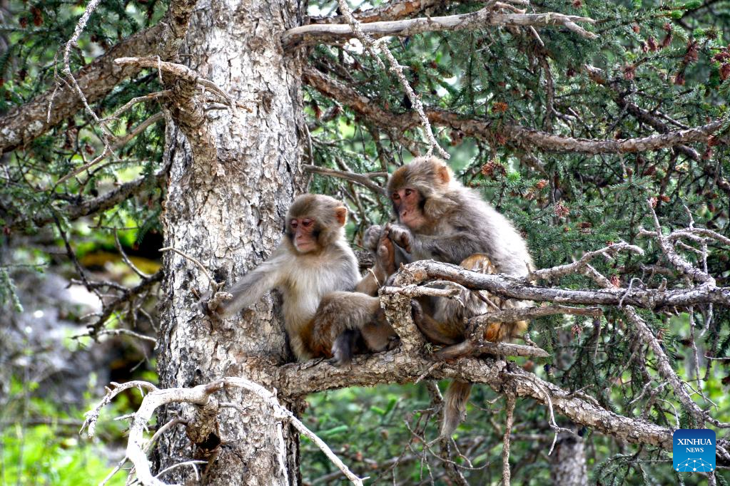 Photo taken on July 11, 2022 shows Tibetan macaques in a forest farm in Baizha Township of Nangqian County, Yushu Tibetan Autonomous Prefecture, northwest China's Qinghai Province. (Xinhua/Liu Zexing)