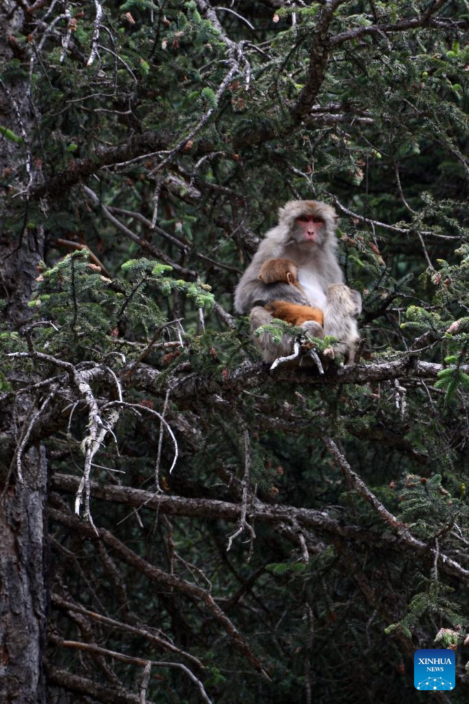 Photo taken on July 11, 2022 shows Tibetan macaques in a forest farm in Baizha Township of Nangqian County, Yushu Tibetan Autonomous Prefecture, northwest China's Qinghai Province. (Xinhua/Fan Peishen)