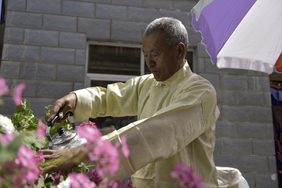 Jingdrol waters flowers in Bangdoi Township of Dagze District, Lhasa, southwest China's Tibet Autonomous Region, May 18, 2022. (Xinhua/Gaesang Namgyae)