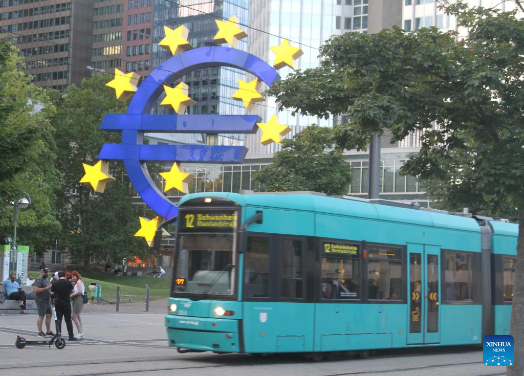 A tram runs past the Euro sculpture in Frankfurt, Germany, on July 12, 2022. For the first time in two decades, the euro on Tuesday falls to parity with the U.S. dollar, meaning one U.S. dollar is equal in value to one euro. (Xinhua/Shan Weiyi)