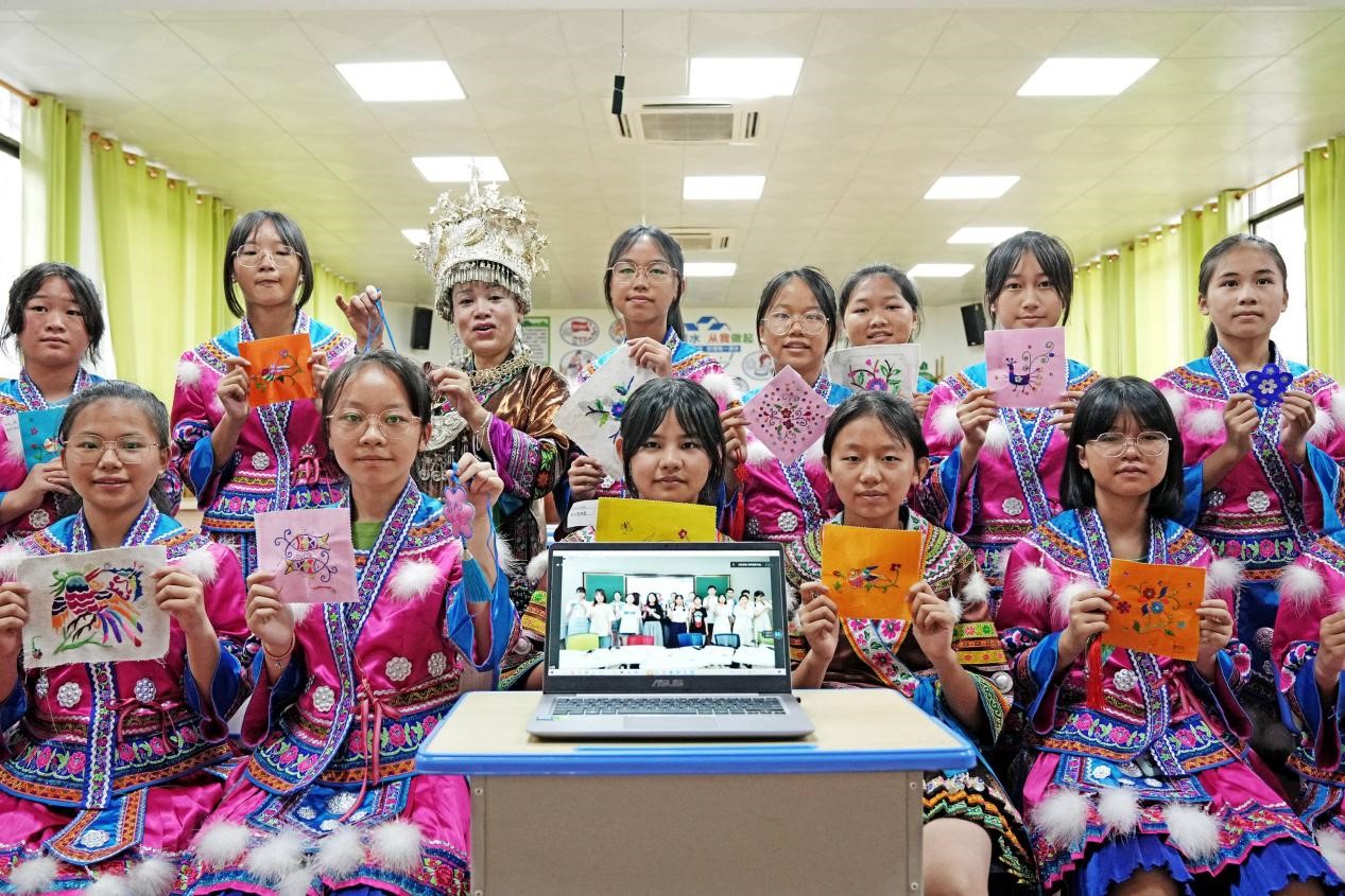 Students from a middle school in Rongshui Miao autonomous county, Liuzhou, south China’s Guangxi Zhuang autonomous region showcase Miao embroidery works with folk artisan Shou Jie (third from left on the second row) on a live class, June 19, 2022. The live class is joined by a group of university students via internet. (People’s Daily Online/Long Tao)