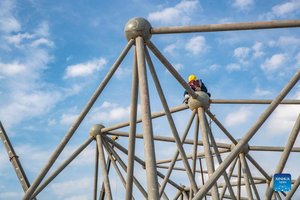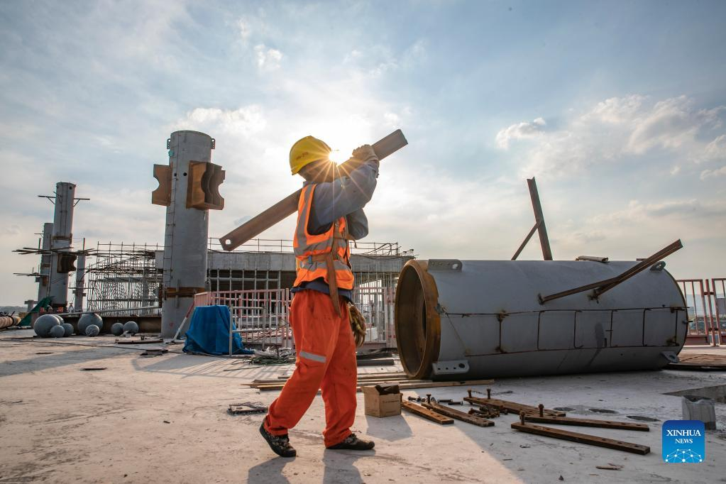 A worker works at the construction site of the T3B terminal project of Chongqing Jiangbei International Airport in southwest China's Chongqing, July 11, 2022. Builders take shifts working for the construction of the T3B terminal project of Chongqing Jiangbei International Airport with preventing heatstroke measures in place. (Xinhua/Huang Wei)