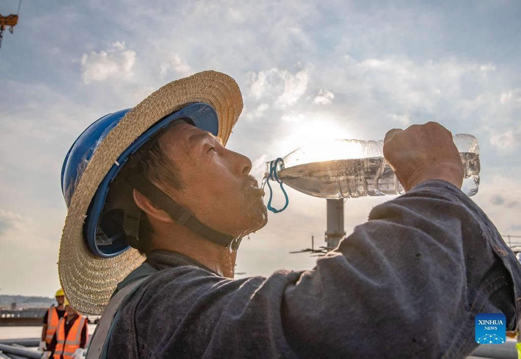 A worker drinks water at the construction site of the T3B terminal project of Chongqing Jiangbei International Airport in southwest China's Chongqing, July 11, 2022. Builders take shifts working for the construction of the T3B terminal project of Chongqing Jiangbei International Airport with preventing heatstroke measures in place. (Xinhua/Huang Wei)
