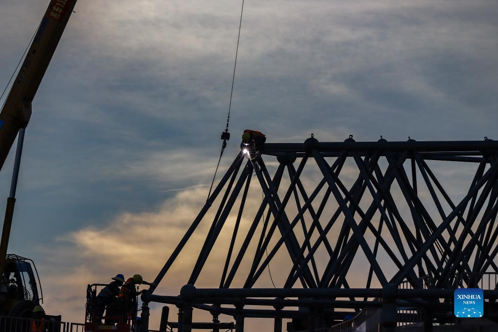 A worker welds at the construction site of the T3B terminal project of Chongqing Jiangbei International Airport in southwest China's Chongqing, July 11, 2022. Builders take shifts working for the construction of the T3B terminal project of Chongqing Jiangbei International Airport with preventing heatstroke measures in place. (Xinhua/Huang Wei)