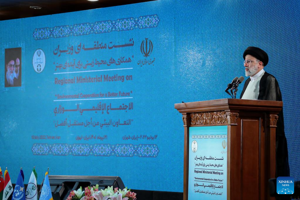 Iranian President Ebrahim Raisi speaks at the Regional Ministerial Meeting on Environmental Cooperation for a Better Future in Tehran, Iran, on July 12, 2022. Raisi on Tuesday slammed Western countries for having played a major role in global environmental destruction over the past centuries. (Iranian Presidential Website/Handout via Xinhua)