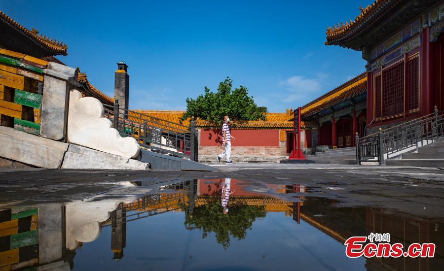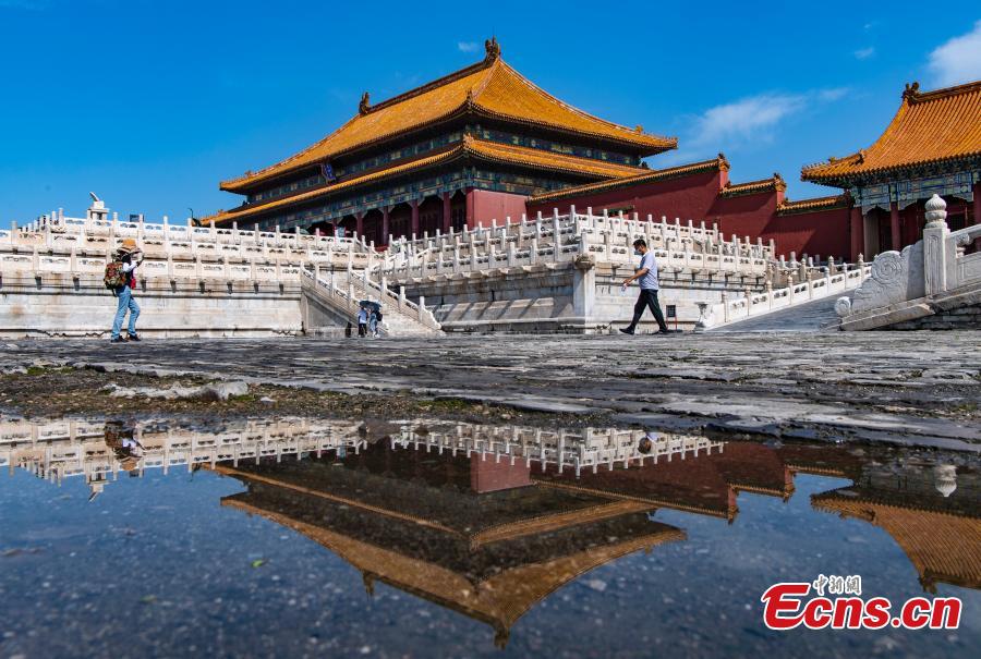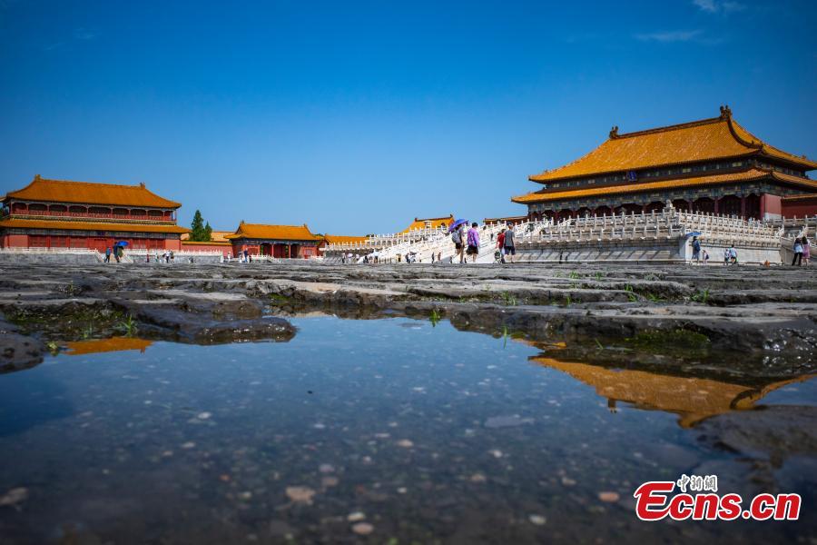 A mirror image of the Palace Museum is reflected in the water after rainfall in Beijing, July 13, 2022. (Photo: China News Service/Hou Yu)