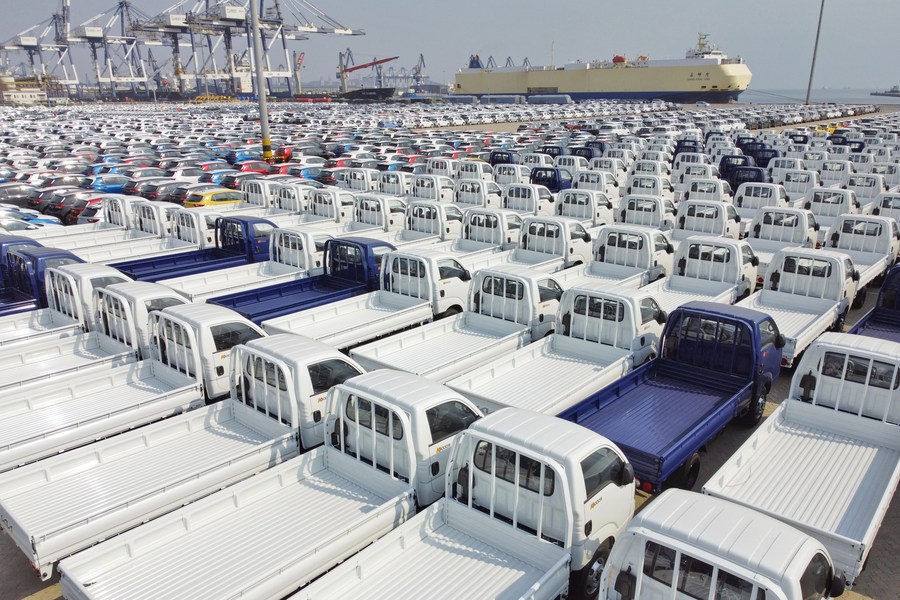 Aerial photo taken on March 7, 2022 shows vehicles to be loaded onto a freight ship at Yantai Port, east China's Shandong Province. (Photo by Tang Ke/Xinhua)