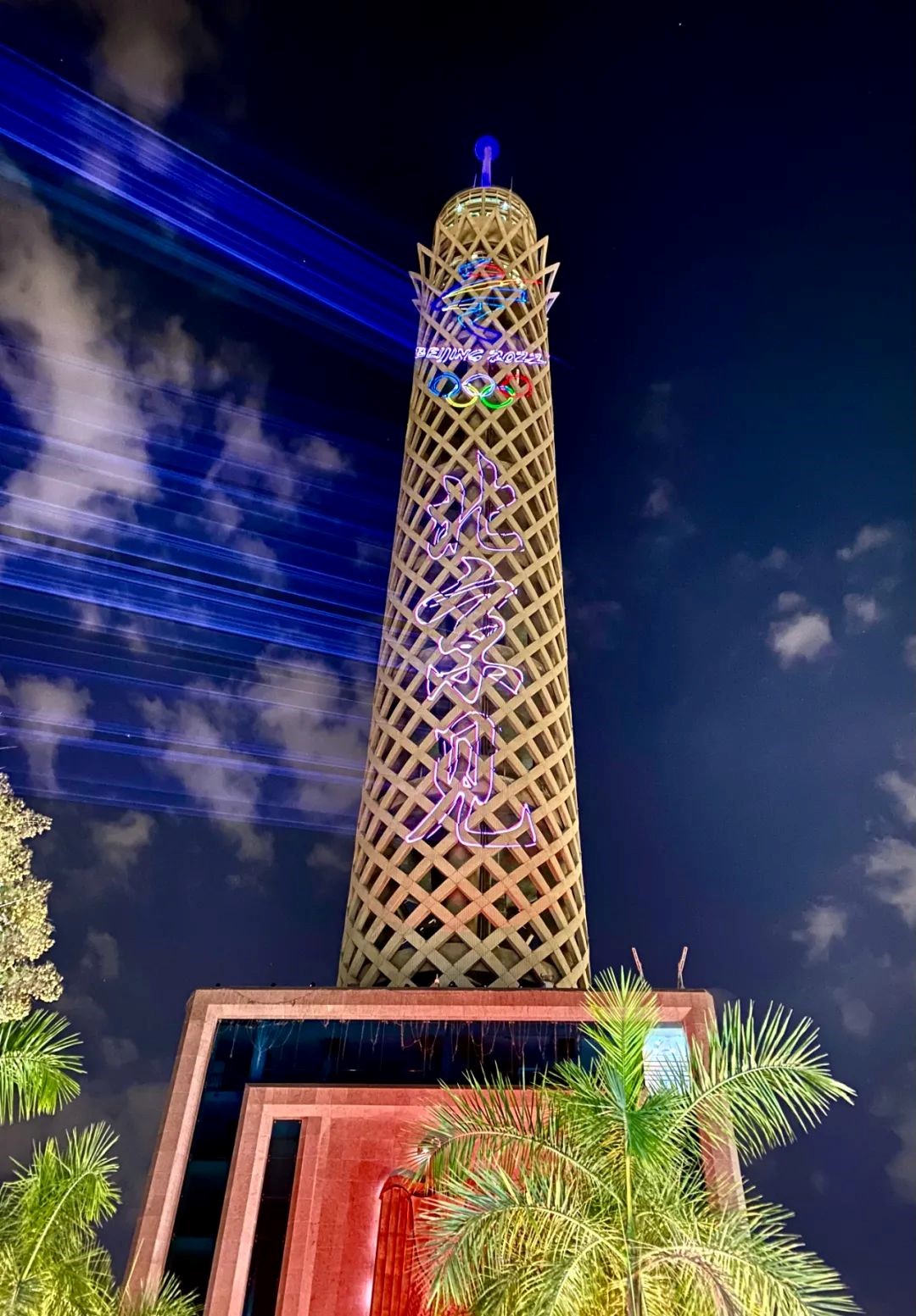 Photo taken on Jan. 24, 2022 shows the Cairo Tower during a light show in Cairo, Egypt. A light show was held at the Cairo Tower for the upcoming Beijing 2022 Winter Olympics. (Photo courtesy of the Chinese Embassy in Egypt)