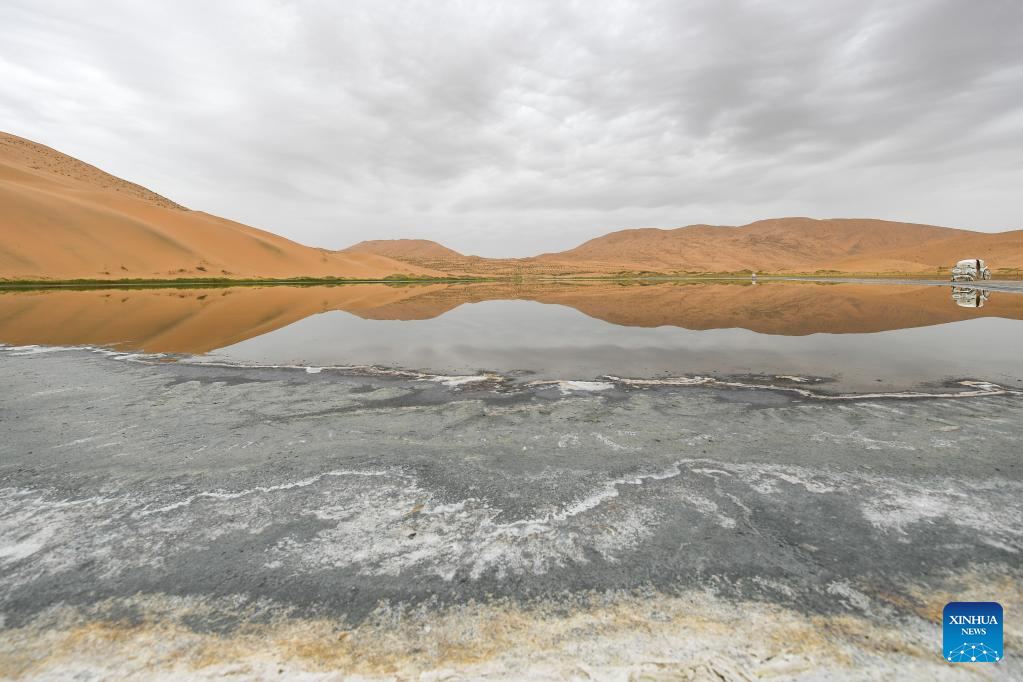 Aerial photo taken on July 13, 2022 shows a lake at the Badain Jaran Desert in north China's Inner Mongolia Autonomous Region. (Xinhua/Bei He)