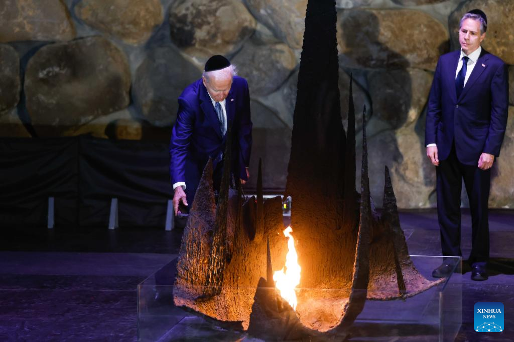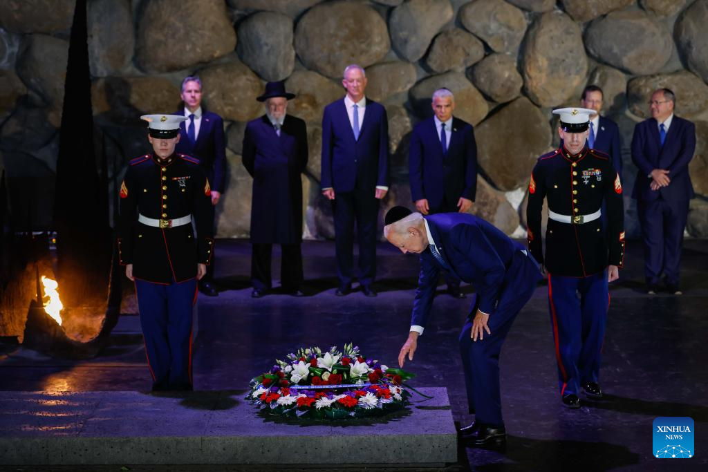 U.S. President Joe Biden (1st R, Front) attends a wreath-laying ceremony at Yad Vashem, Israel's Holocaust memorial in Jerusalem, on July 13, 2022. Biden landed in Israel on Wednesday afternoon, starting his first visit to the Middle East as president, during which he will hold talks with officials of Israel, Palestine, and Saudi Arabia. (Olivier Fitoussi/JINI via Xinhua)