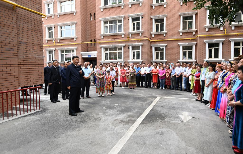 Chinese President Xi Jinping, also general secretary of the Communist Party of China Central Committee and chairman of the Central Military Commission, speaks with people of various ethnic groups while visiting the community of Guyuanxiang in the Tianshan District in the city of Urumqi, capital of northwest China's Xinjiang Uygur Autonomous Region, July 13, 2022. (Xinhua/Xie Huanchi)