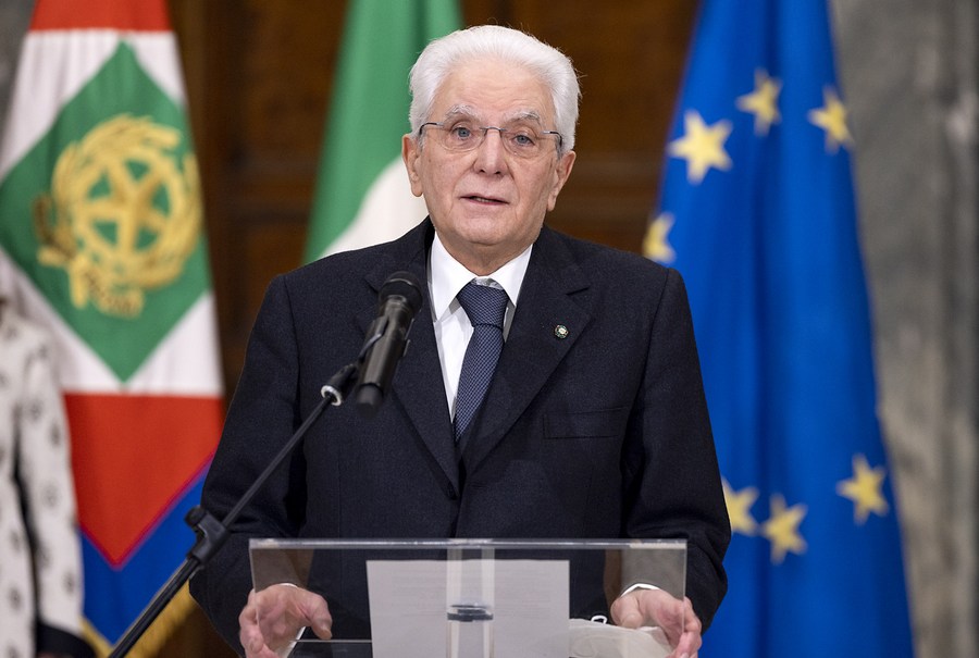 Italian President Sergio Mattarella makes a declaration after receiving the official notice of his re-election at the Quirinale presidential palace in Rome, Italy, on Jan. 29, 2022. (Str/Xinhua)