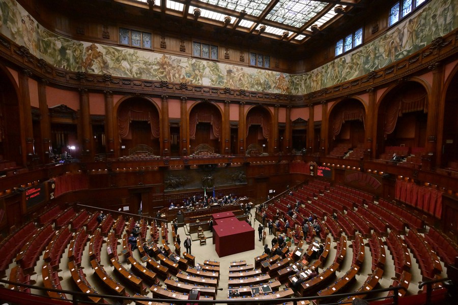 Members of Italy's parliament attend a voting session to elect Italy's new president in Rome, Italy, on Jan. 28, 2022. (Photo by Alberto Lingria/Xinhua)
