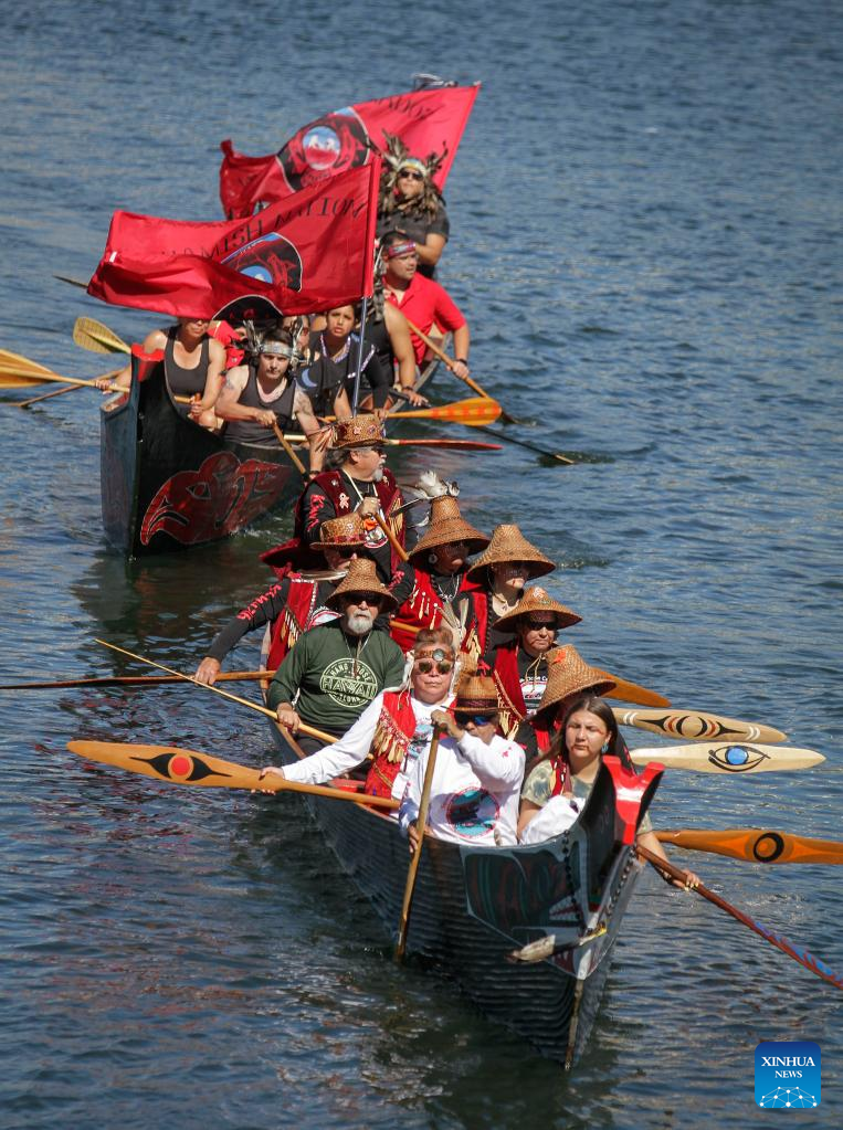 Indigenous people paddle during a canoe arrival ceremony at False Creek in Vancouver, British Columbia, Canada, on July 14, 2022. Indigenous people participated in the canoe arrival ceremony on Thursday to mark the opening of the Sacred Journey exhibition at Science World in Vancouver. The Sacred Journey is an exhibition showcasing Northwest Coast canoe cultures and the indigenous people's way of life. (Photo by Liang Sen/Xinhua)