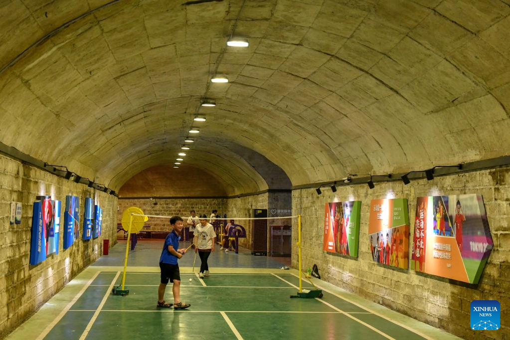 Residents play badminton in an air-raid shelter in Jinan, east China's Shandong Province, July 8, 2022. Due to hot weather this summer, Jinan has opened nine air-raid shelters for free, providing citizens with leisure, reading, sports and fitness services. (Xinhua/Zhu Zheng)