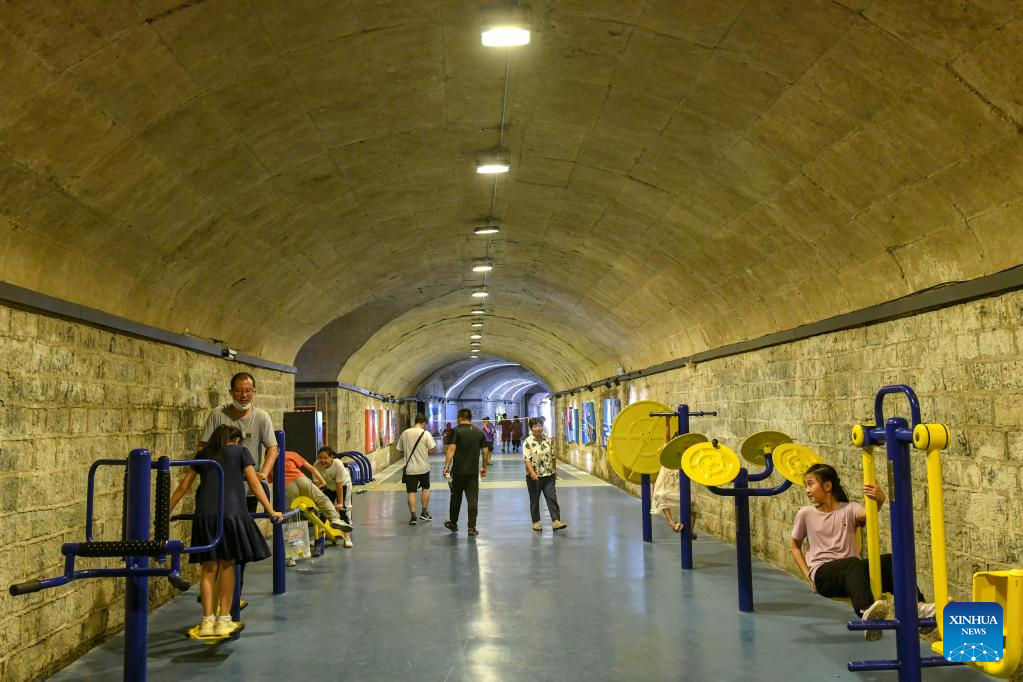 Residents exercise in an air-raid shelter in Jinan, east China's Shandong Province, July 8, 2022. Due to hot weather this summer, Jinan has opened nine air-raid shelters for free, providing citizens with leisure, reading, sports and fitness services. (Xinhua/Zhu Zheng)