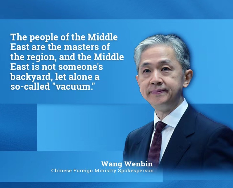 BEIJING, July 15 (Xinhua) -- The people of the Middle East are the masters of the region, and the Middle East is not someone's backyard, let alone a so-called "vacuum," Chinese foreign ministry spokesperson Wang Wenbin said Friday.