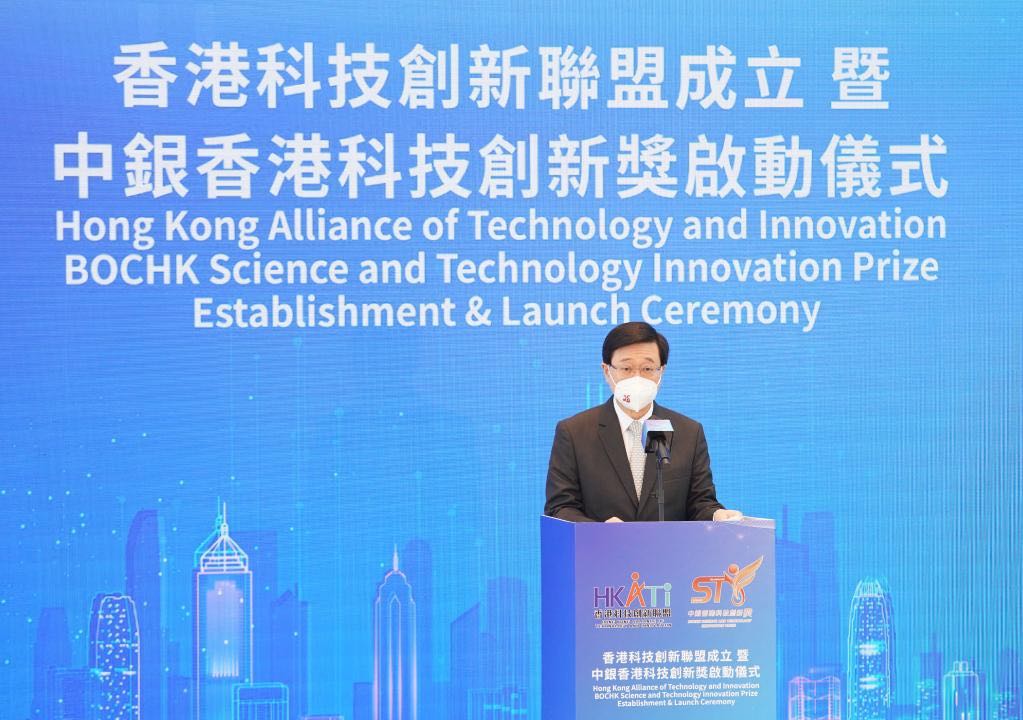 Chief Executive of the Hong Kong Special Administrative Region (HKSAR) John Lee addresses an event launching the Hong Kong Alliance of Technology and Innovation in Hong Kong, south China, July 15, 2022. (Xinhua/Lui Siu Wai)