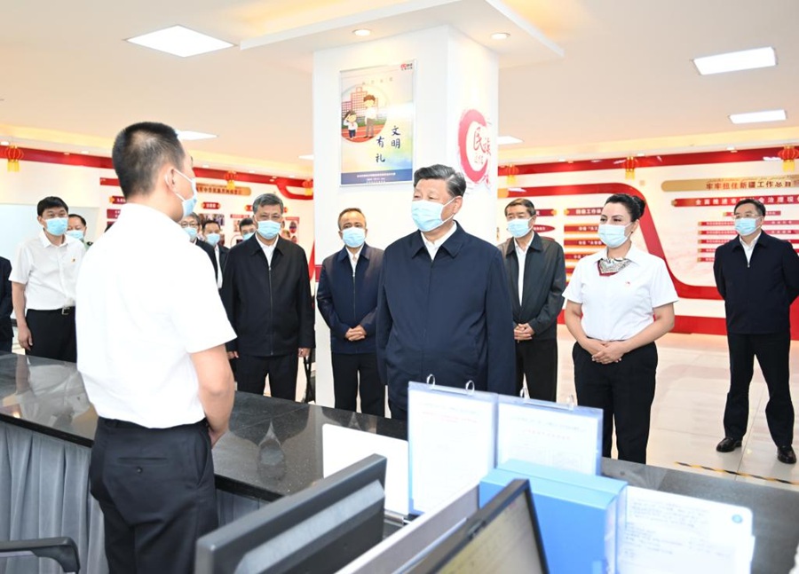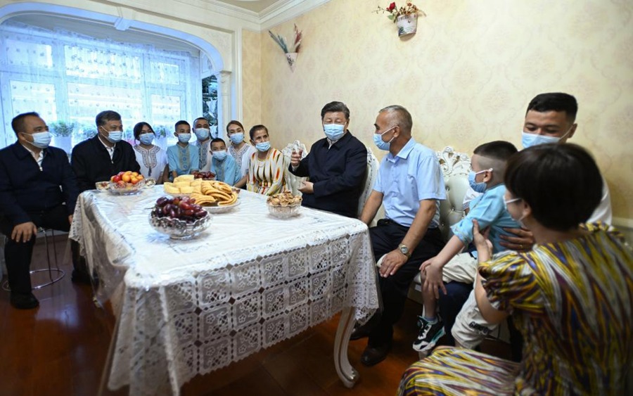On Wednesday morning, Xi visited the residential community of Guyuanxiang in the Tianshan District in Urumqi, in which people from ethnic-minority groups account for more than 95 percent of the total residents.