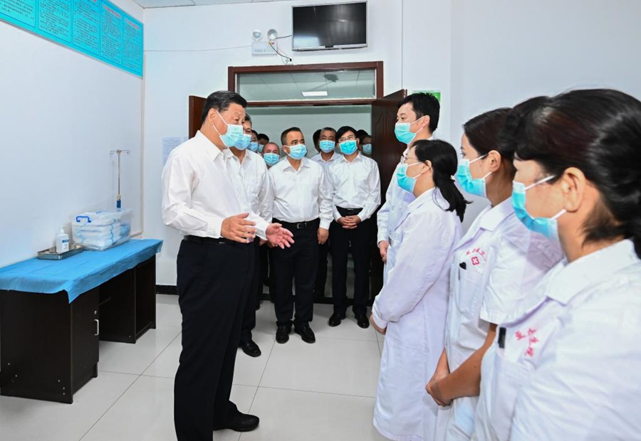 Chinese President Xi Jinping, also general secretary of the Communist Party of China Central Committee and chairman of the Central Military Commission, visits an infirmary in a local village of Turpan, northwest China's Xinjiang Uygur Autonomous Region, July 14, 2022. Xi made an inspection tour in Xinjiang from Tuesday to Friday. (Xinhua/Yan Yan)
