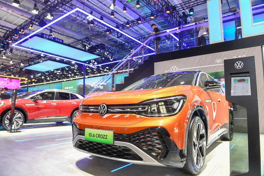 An electric vehicle is displayed at the booth of the FAW-Volkswagen during the 19th China (Changchun) International Automobile Expo in Changchun, capital of northeast China's Jilin Province, July 15, 2022. (Xinhua/Zhang Nan)
