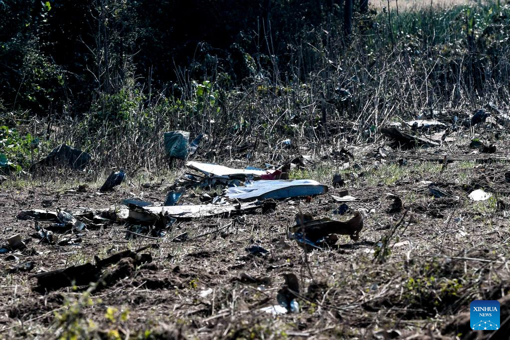 Photo taken on July 17, 2022 shows plane debris scattered in a field near Kavala city in northern Greece.