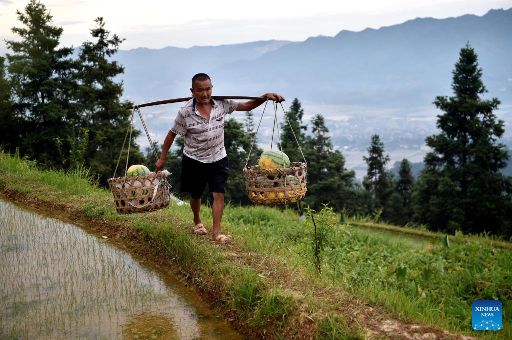 A villager transports watermelons in Zhongcheng Town of Rongjiang County, southwest China's Guizhou Province, July 16, 2022. Recently, Rongjiang County has held various watermelon festivals to help farmers promote watermelon sales during the harvest season.