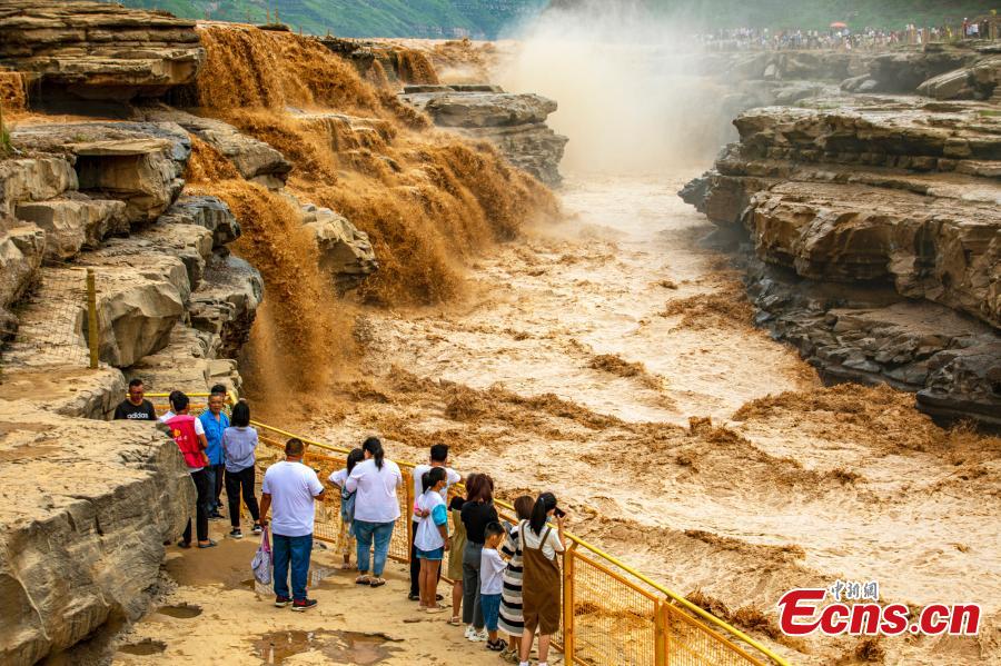 Tourists view the Hukou waterfall at the border area between north China's Shanxi and northwest China's Shaanxi provinces, July 17, 2022. (Photo: China News Service/Lan Hua)