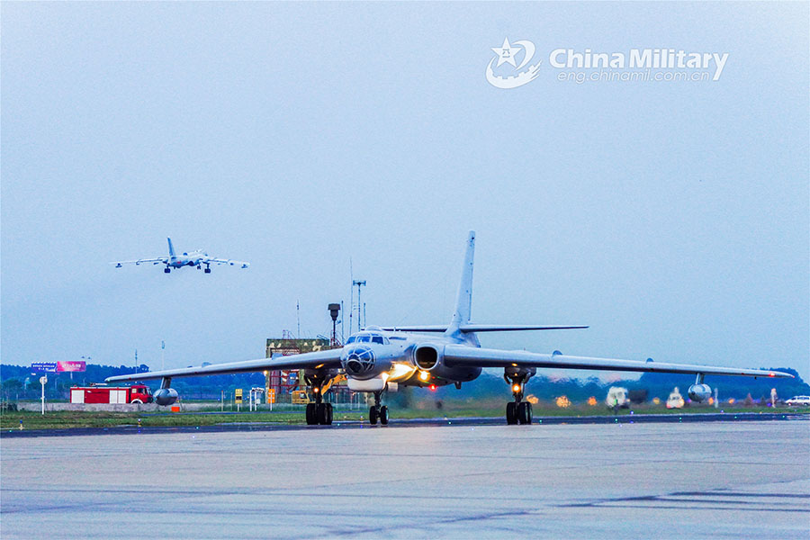 An H6 bomber attached to an aviation regiment with the navy under PLA Eastern Theatre Command taxis on the runway during a round-the-clock flight training exercise on June 15, 2022. (eng.chinamil.com.cn/Photo by Hu Fei)