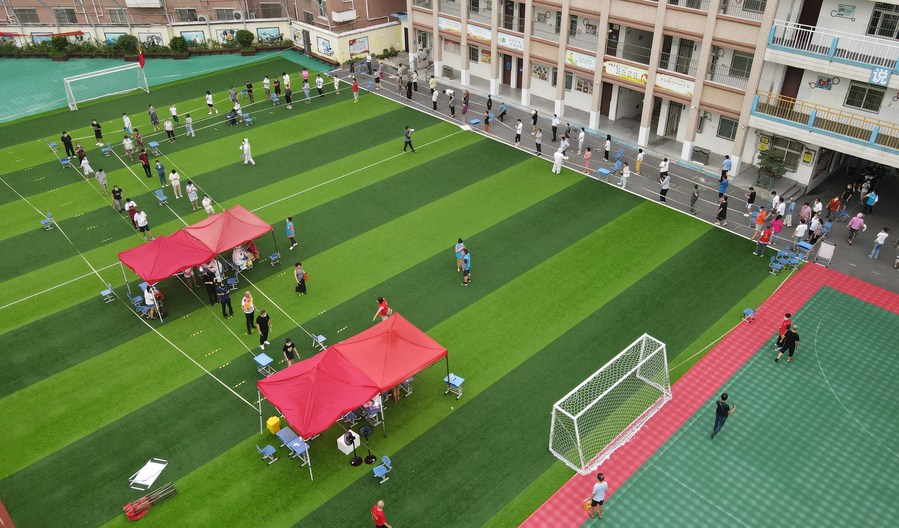 Aerial photo taken on July 16, 2022 shows citizens standing in lines to take nucleic acid tests in Bengshan District of Bengbu City, east China's Anhui Province. (Xinhua/Zhou Mu)