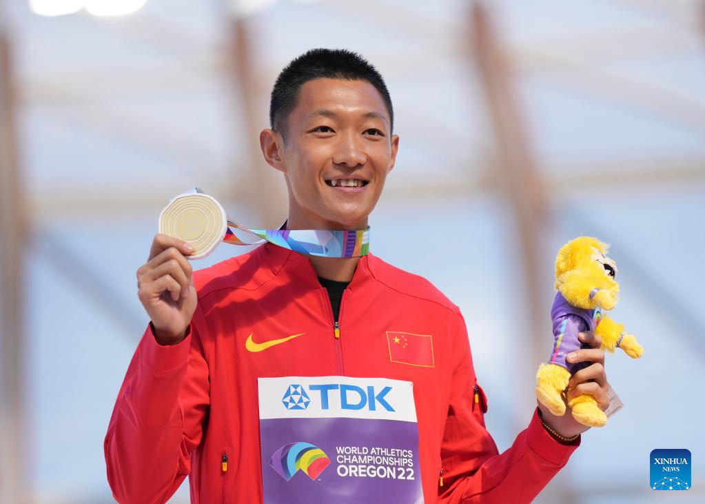 Gold medalist China's Wang Jianan celebrates during the medal ceremony for the men's long jump event at the World Athletics Championships Oregon22 in Eugene, Oregon, the United States, July 17, 2022. (Xinhua/Wang Ying)