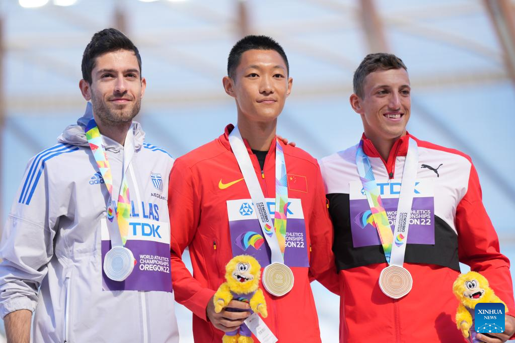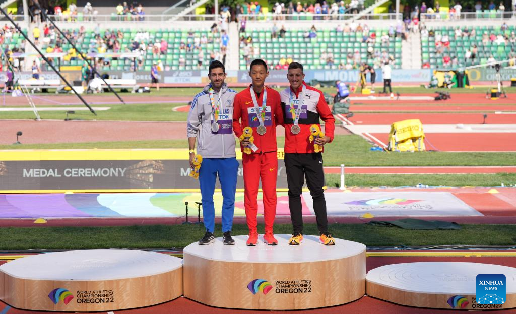 Gold medalist China's Wang Jianan (C), silver medalist Greece's Miltiadis Tentoglou (L) and bronze medalist Switzerland's Simon Ehammer pose on the podium during the medal ceremony for the men's long jump event at the World Athletics Championships Oregon22 in Eugene, Oregon, the United States, July 17, 2022. (Xinhua/Wu Xiaoling)