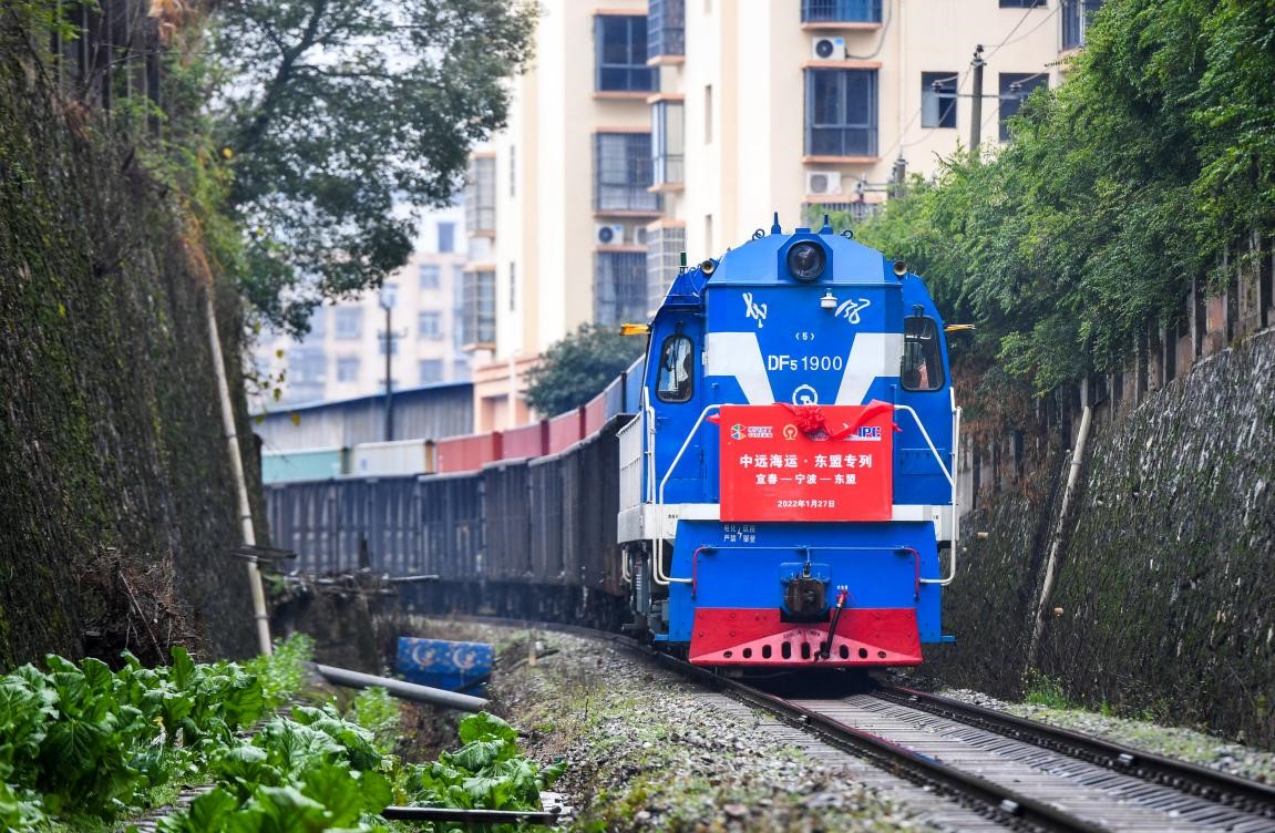 The first freight train running between Yichun, east China's Jiangxi province, and ASEAN countries via Ningbo, east China's Zhejiang province departs from a train station in Yichun, Jan. 27, 2022. (People's Daily Online/Zhou Liang)