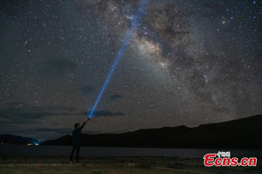 Stars sparkle in the sky over Yamdrok Lake in Nagarze County of Shannan Prefecture, Southwest China's Tibet Autonomous Region. The Yamdrok Lake is 4,441 meters above sea level and one of the three holy lakes in Tibet region. (Photo: China News Service/Jiang Feibo)
