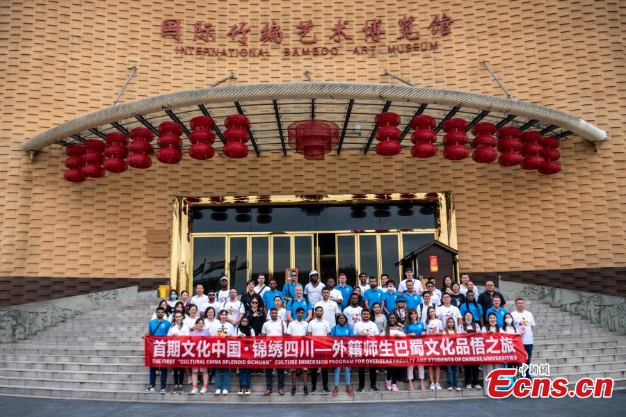 Foreigners pose for group photos in front of the International Bamboo Art Museum in Meishan city, southwest China's Sichuan Province, July 18, 2022. (Photo: China News Service/Liu Zhongjun)