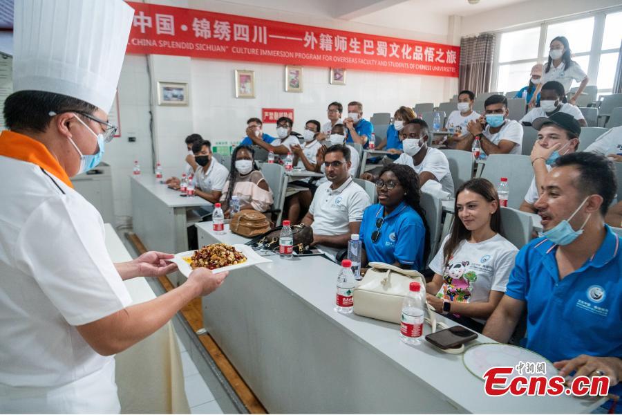 Foreigners learn to cook Sichuan dish "Kung Pao Chicken" during the Bashu themed cultural activity in Meishan city, southwest China's Sichuan Province, July 18, 2022. (Photo: China News Service/Liu Zhongjun)